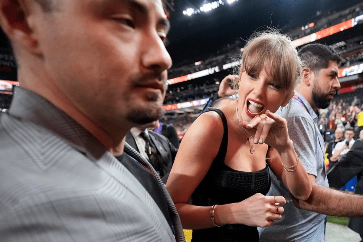 Taylor Swift walks on the field after the NFL Super Bowl 58 football game between the San Francisco 49ers and the Kansas City Chiefs, Sunday, Feb. 11, 2024, in Las Vegas. The Kansas City Chiefs won 25-22 against the San Francisco 49ers. (AP Photo/Ashley Landis)
