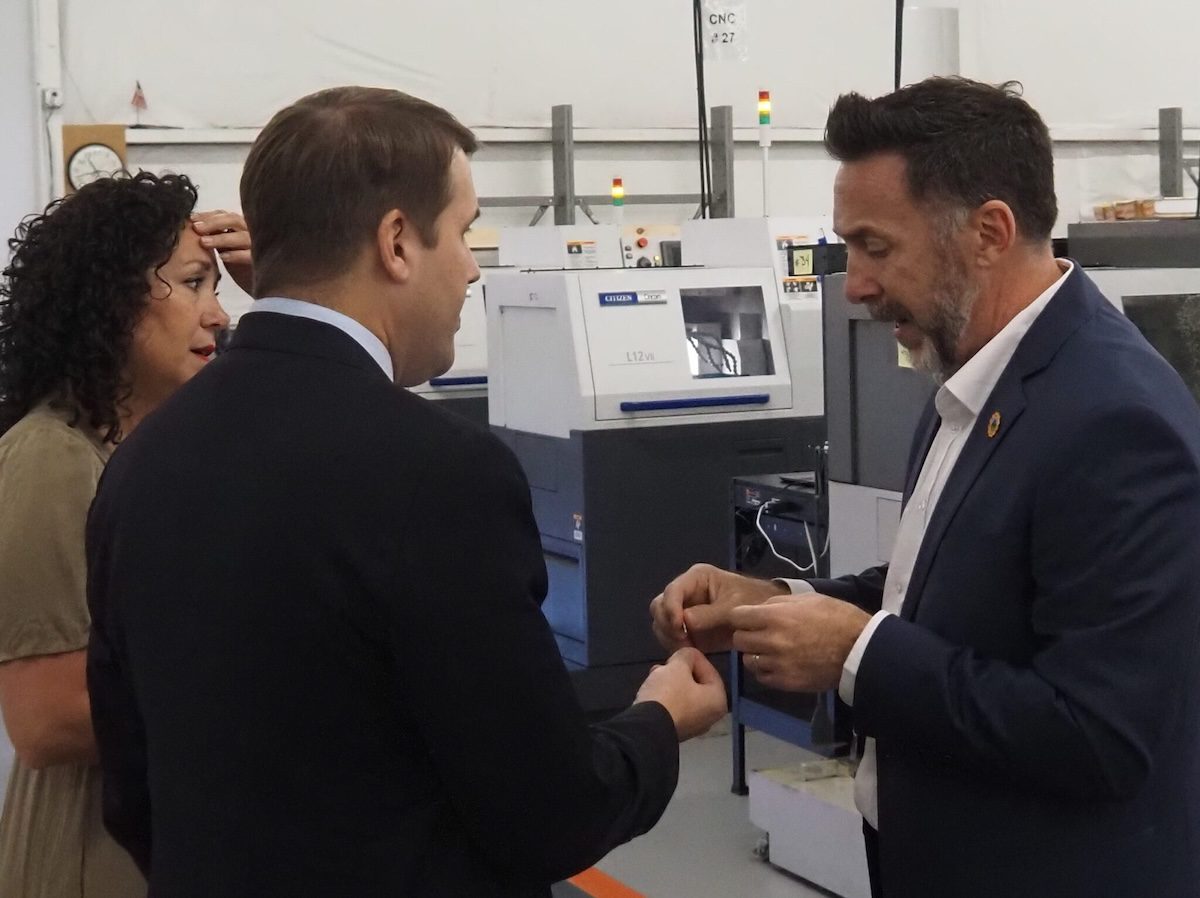Aaron and Adria Bagshaw, who run H.G. Bagshaw together, show U.S. Rep. Chris Pappas (center) one of the small metal pieces they create in their Hudson plant. (Photo by William Skipworth/New Hampshire Bulletin)
