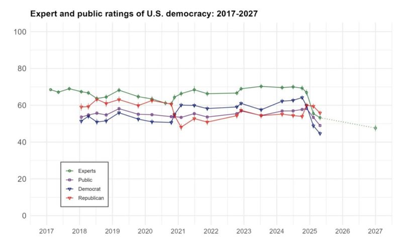 “The reason, I think, for that is the experts tend to have a broader perspective,” he said. “They know what’s going on at home, but they also tend to know much more than our public sample about what a democracy operates overseas. And you know, when you have that information, you tend to rate American democracy higher.”