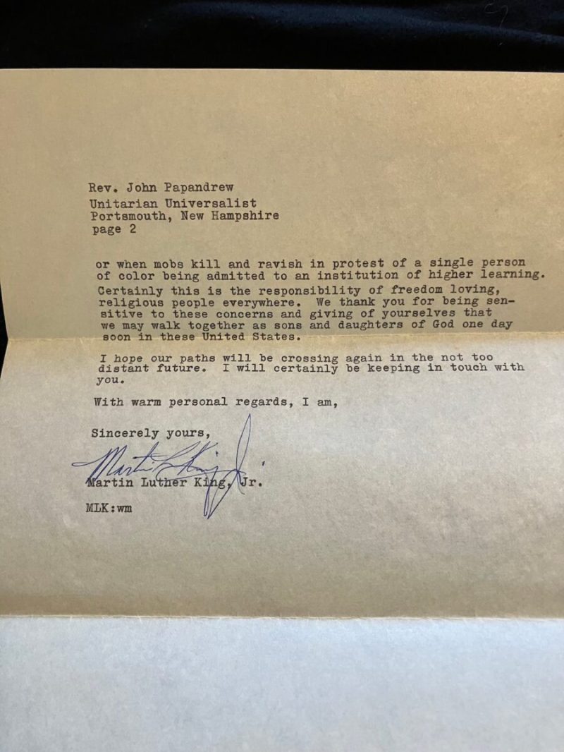“For several weeks I have intended writing to express my personal appreciation to you for your marvelous witness in Albany, but the accumulation of a flood of mail has stood in my way,” King wrote to Papandrew in part. “The smoke is gradually clearing from the non-violent battle at Albany, and as we assess the results we all agree that one of the high points of the summer was the contribution rendered by our brothers from the North who came to share with us in the fight against injustice.”