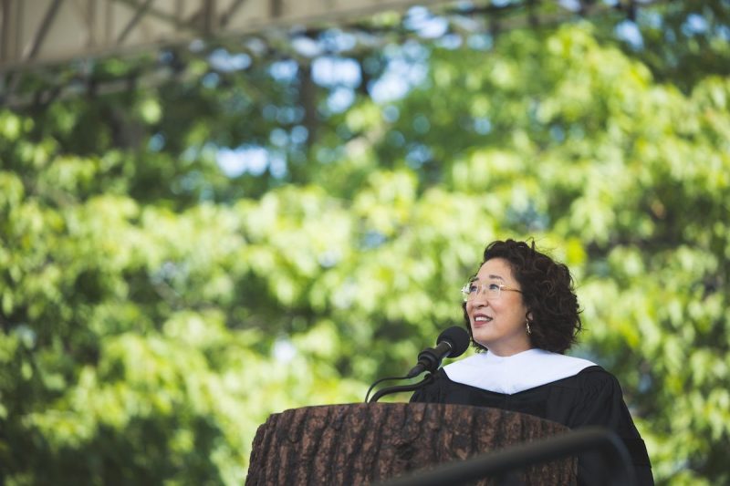 The “Grey’s Anatomy” and “Killing Eve” star ended her speech by channeling her iconic TV character Dr. Cristina Yang, asking graduates and guests to “dance it out” to David Guetta’s “Titanium” (co-written and performed by Sia). From the stage to the bleachers, the crowd got on their feet, and Oh danced along with them.