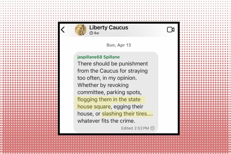 A leaked encrypted text message from a Signal group chat featuring prominent New Hampshire conservative lawmakers appears to show a state representative encouraging the use of violence against fellow Republicans for voting against the direction of leadership.